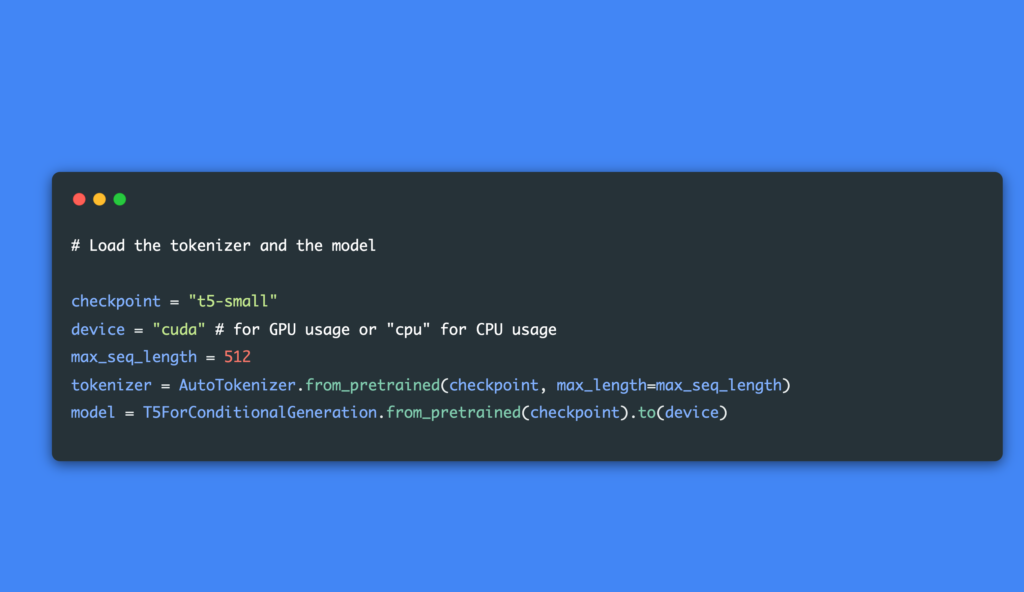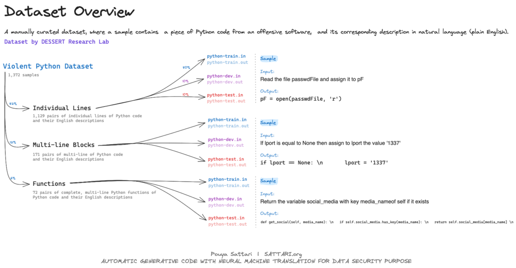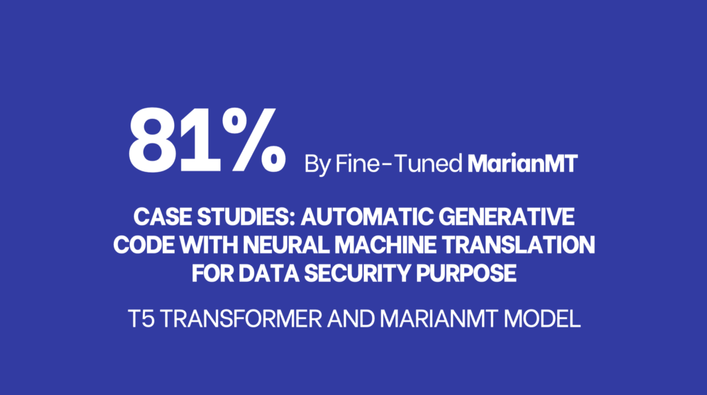 In our project, “Automatic Generative Code with Neural Machine Translation for Data Security Purposes,” we use the T5 Transformer and MarianMT model. Our dataset comes from the violent-python repository, containing Python code from offensive software and plain English descriptions. This dataset helps us train the model to translate both English Commands to Code snippets.