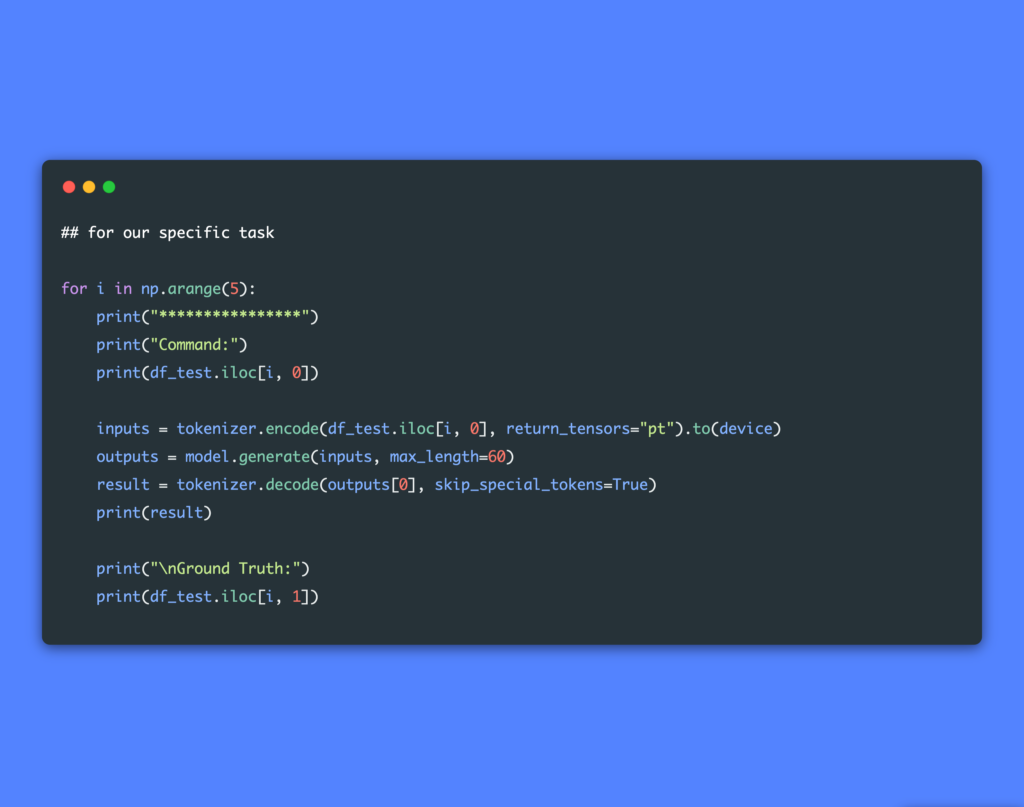The objective is to evaluate the model’s performance on our tailored task, distinct from its pre-trained capabilities. Each command is tokenized and fed into the model, with the generated output compared against the ground truth for assessment.