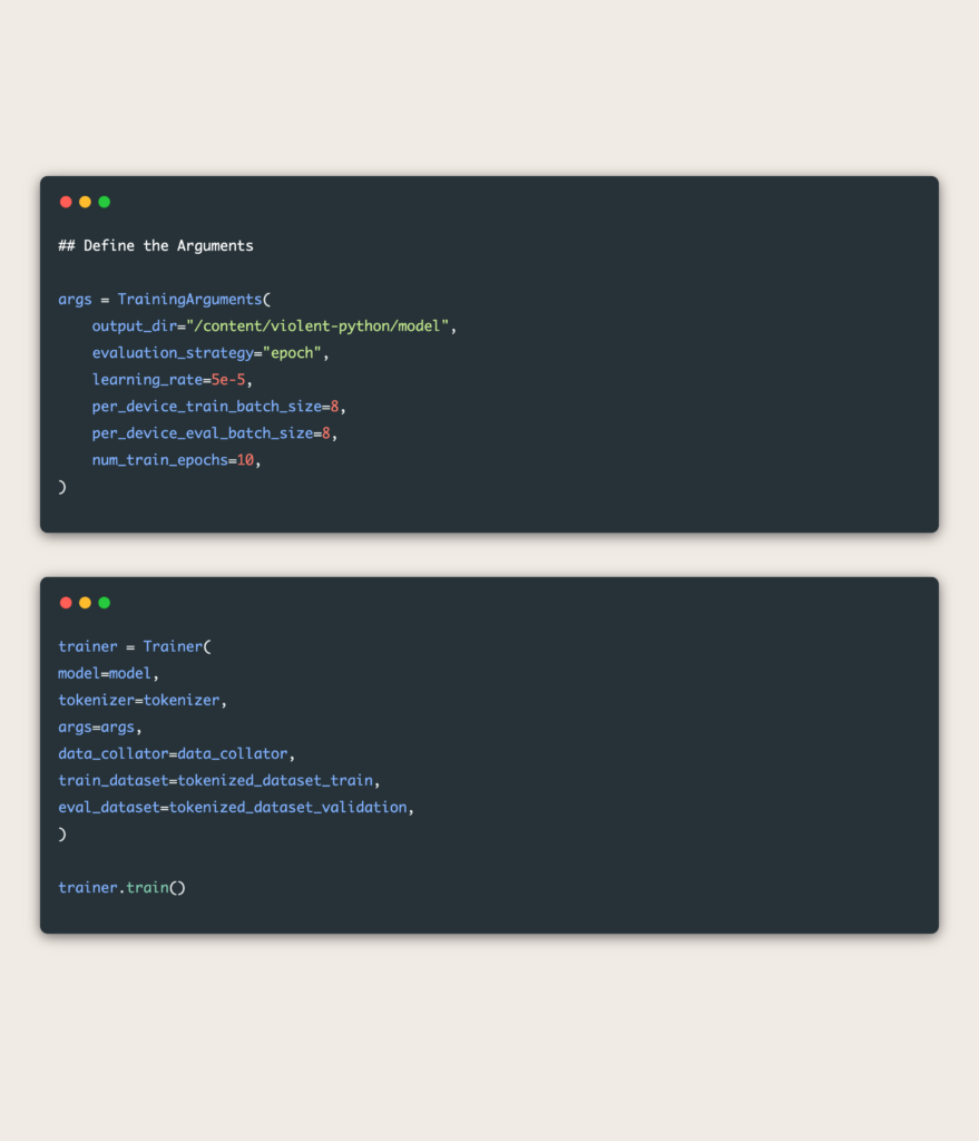 The Trainer object is then configured with the model, tokenizer, and these parameters, using tokenized datasets for training and validation.