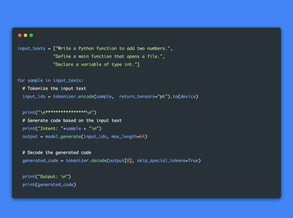Utilizing a pre-trained language model and tokenizer, the code accurately responds to instructions like adding two numbers, defining a main function, and declaring a variable of type int.